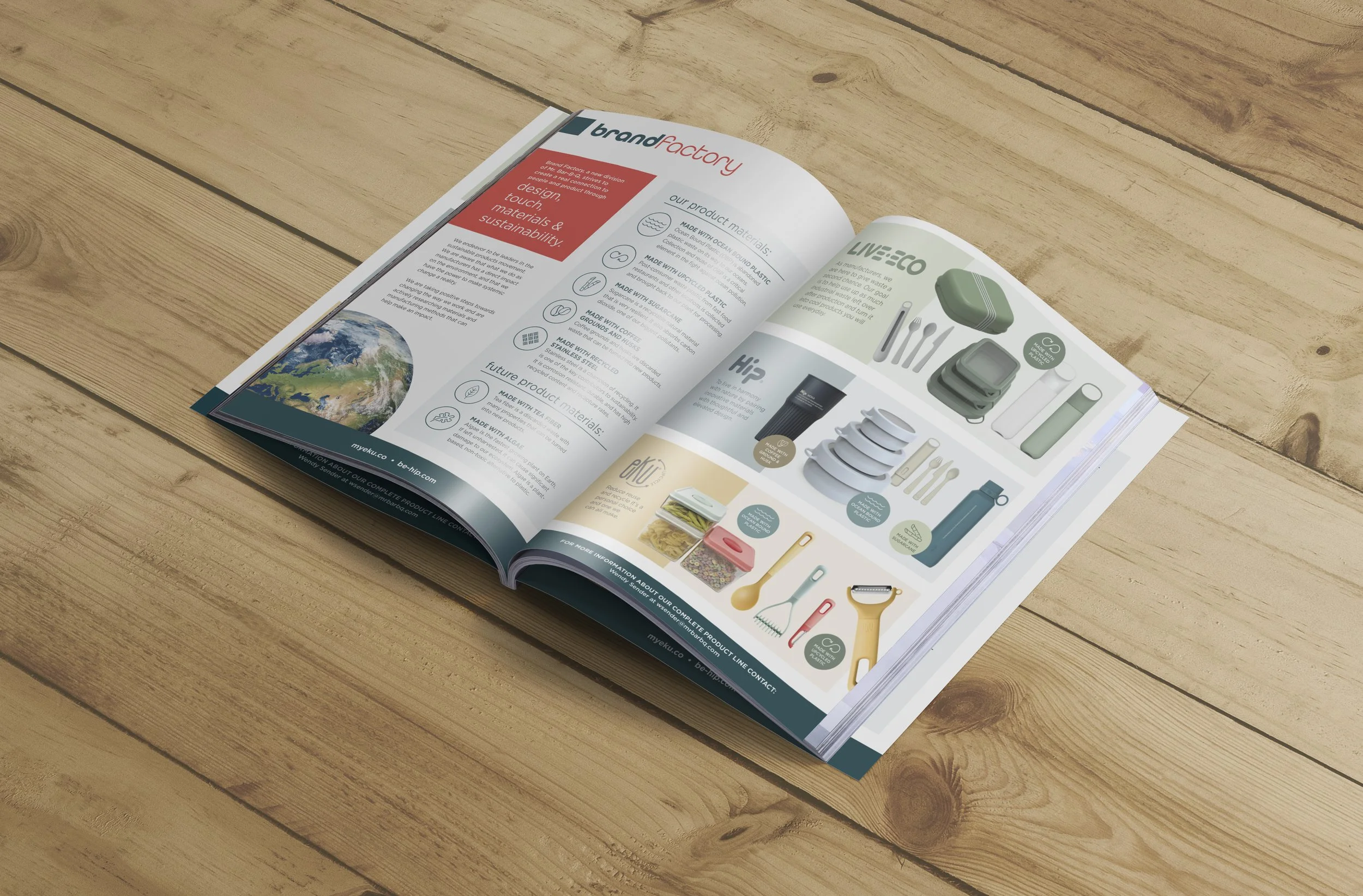 Catalog layout and design for Brand Factory, showcasing multiple brands in an eco-friendly product line.